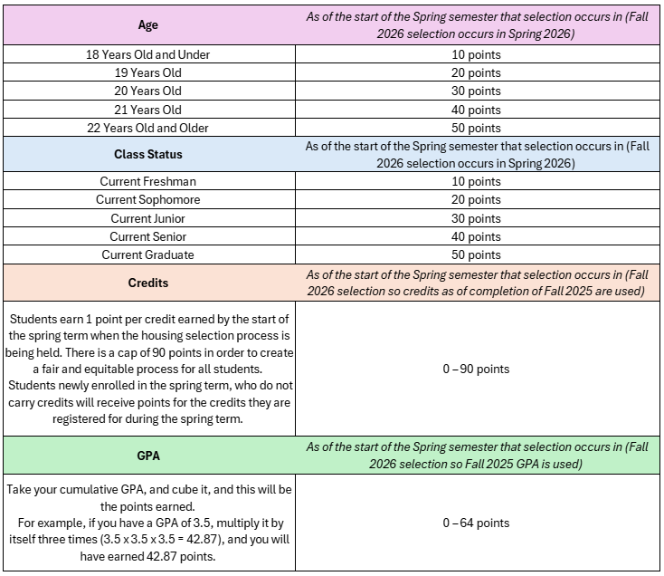 Priority Numbers are based on Priority Points earned by each student. Numbers typically range from 1 to 600, with lower numbers receiving earlier housing selection times. Students selecting housing with roommates will have their Priority Points averaged to create a Group Priority Number, which determines the order in which roommate groups choose their housing.
